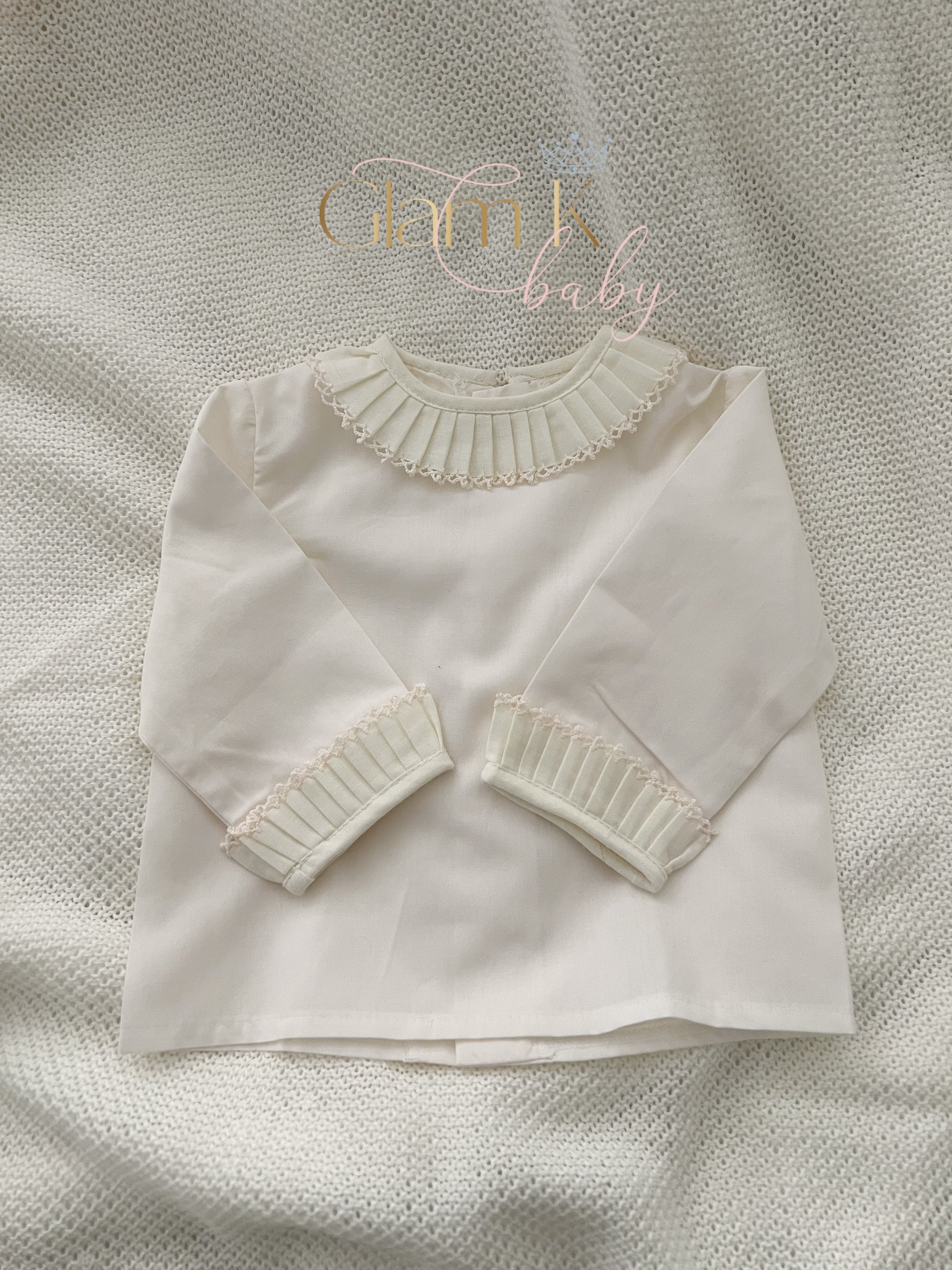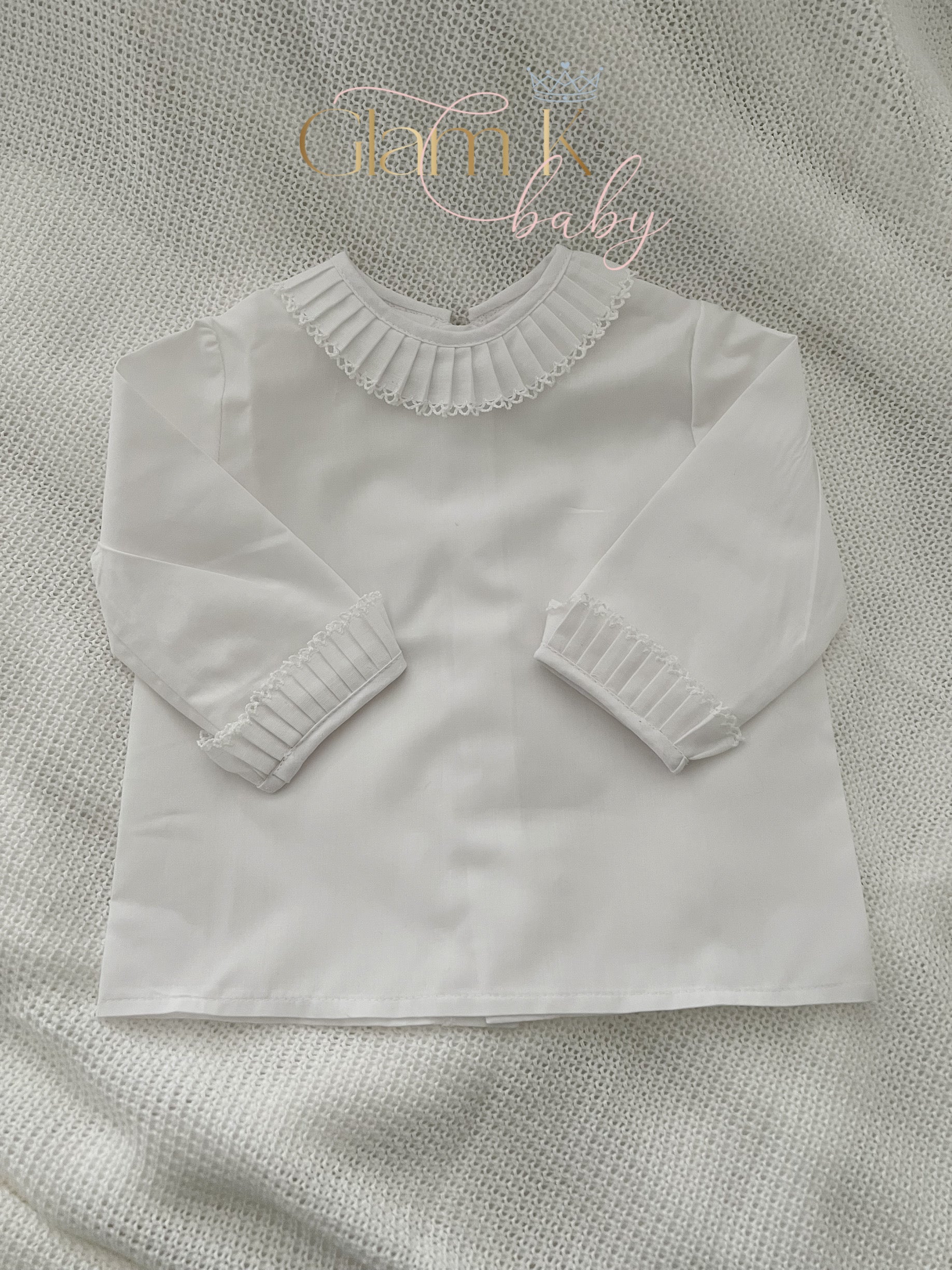 A timeless piece for your little one’s wardrobe, this baby shirt is designed with a classic long-sleeve silhouette. It features an elegant pleated collar and matching pleated cuffs, each delicately finished with lace trim for a refined touch. Crafted from soft, lightweight fabric, it ensures comfort while adding sophistication to any outfit—perfect for pairing with dressy bottoms or completing a special occasion look.