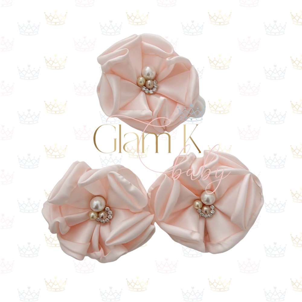 Material: Luxe Satin Ribbon Flower. Soft Stretchy Nylon. Pearl & Swarovski beads.