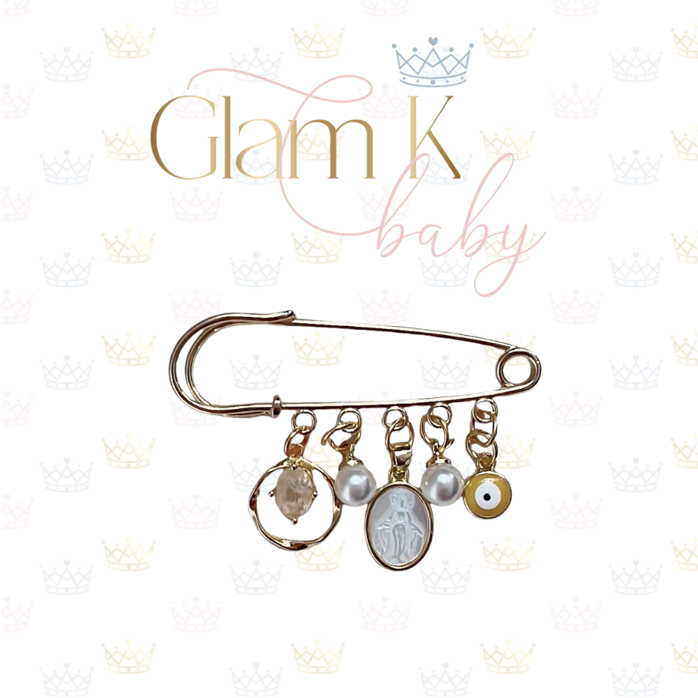 This Absolutely beautiful 18K Gold Plated Baby Brooch Pin is accented with 2-Pearl Beads, Gold Plated Mother Mary, Yellow enabled round Evil Eye, and a Gold Framed Gemstone Charms.